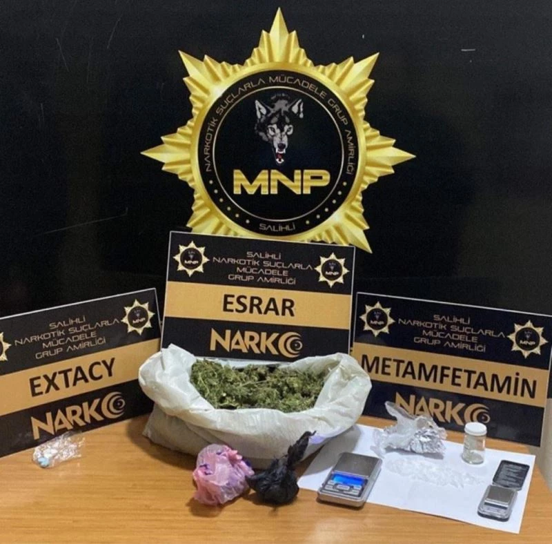 Manisa İl Emniyet Müdürlüğü Salihli Narkotik Suçlarla Mücadele Grup Amirliği görevlilerince uyuşturucu veya uyarıcı madde ticareti yapan, nakleden ve kullanan şahıslara yönelik yapılan çalışmalarda Salihli ilçesinde durdurulan şahısların üzerinde yapılan aramada, 3 parça halinde 412,62 gram esrar maddesi, 2 parça halinde 15,78 gram metamfetamin maddesi, 5 adet Ecstasy hap, 2 adet hassas terazi ele geçirildi. Konuyla ilgili 2 şüpheli şahıs yakalanırken, şüphelilerden U.E. (31), ’Uyuşturucu veya uyarıcı madde imal ve ticareti yapmak’ suçundan gözaltına alınarak sevk edildiği adli makamlarca tutuklandı.