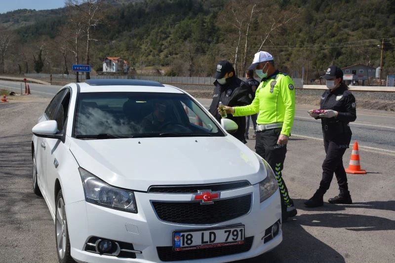 Polis ekipleri Yenice-Zonguldak yolu üzerinde bulunan noktada uygulama yaparak hem Polis Haftası’nı sürücülerle birlikte kutladılar hem de korona virüse karşı vatandaşları uyardılar. Uygulama noktasında araçları durdurarak araç içerisinde maske takımı, sosyal mesafenin korunması için sürücülere ve araçlarda yolculuk edenleri uyaran ekipler, emniyet kemeri takmaları, seyir halindeyken cep telefonu kullanmamaları ve trafik kurallarına uymaları konusunda da uyarıda bulundular. Ekipler, Türk Polis Teşkilatı’nın 176.yılı dolayısıyla da sürücülere ve araçta bulunanlara kolonya ve çikolata ikram etti.