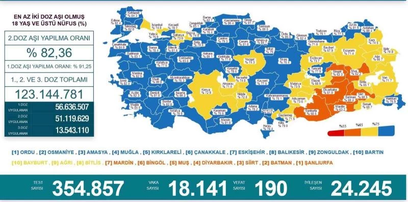 Öte yandan Türkiye genelinde 2. doz aşı yapılma oranı yüzde 82,36 oldu. Ülke genelinde 1., 2. ve 3. doz aşı toplamı ise 123 milyon 144 bin 781’e yükseldi.