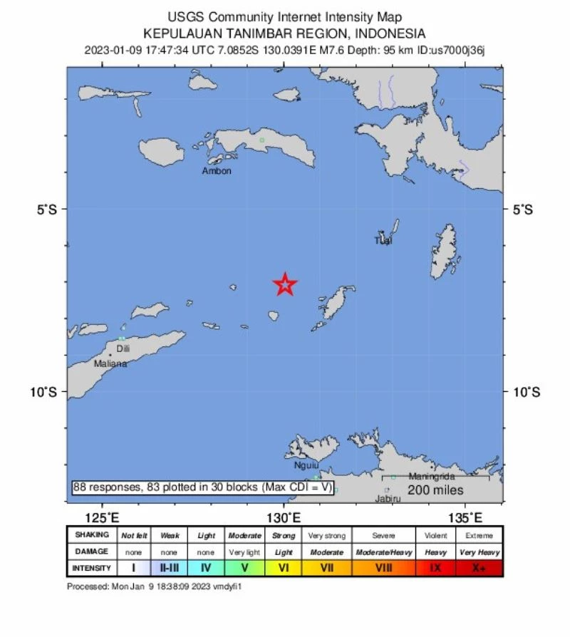 ABD Jeolojik Araştırma Merkezi (USGS) tarafından yapılan açıklamada, Endonezya’ya bağlı Tanimbar Adaları’nın bulunduğu bölgede 7.6 büyüklüğünde deprem meydana geldiği bildirildi. USGS, depremin 95 kilometre derinlikte yaşandığını açıkladı.