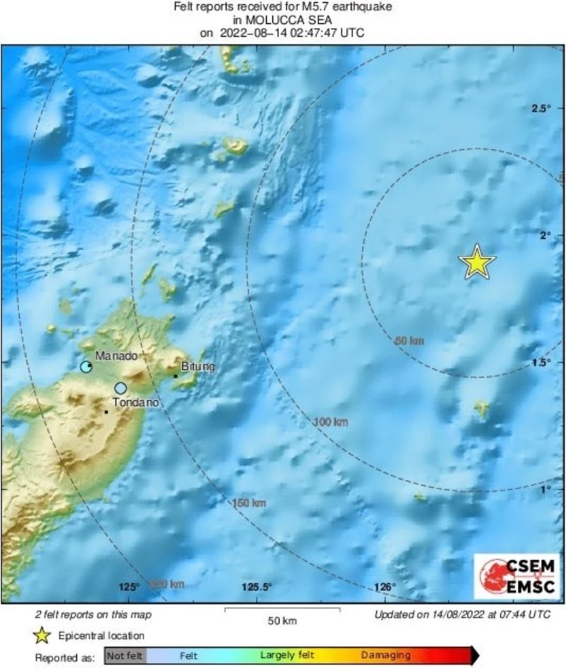 ABD Jeolojik Araştırma Merkezi (USGS), Endonezya’nın Kuzey Sulawesi eyaletine bağlı Laikit kasabasından yaklaşık 158 kilometre uzaklıkta 5,7 büyüklüğünde deprem meydana geldiğini açıkladı. Depremin denizin yaklaşık 30 kilometre derinlikte meydana geldiği belirtildi.