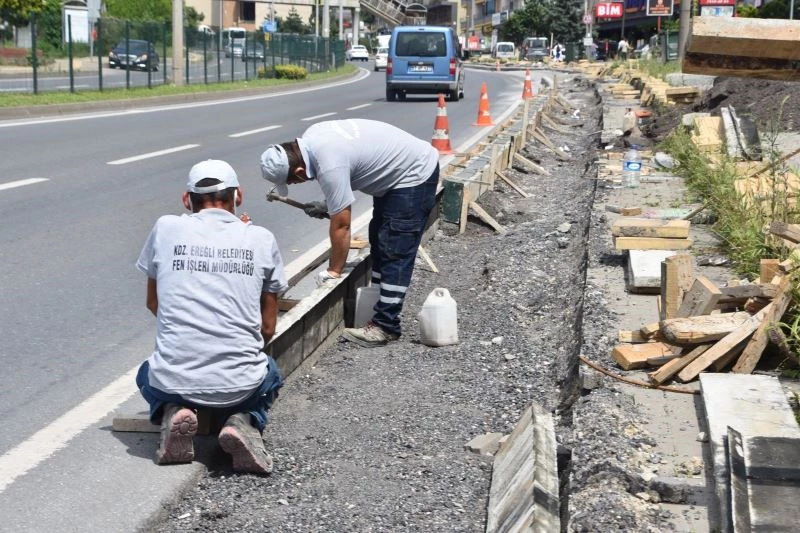 Kdz. Ereğli Belediyesi Fen İşleri Müdürlüğü ekipleri, 5 kilometreyi kapsayan çalışma kapsamında kabloların yer altına alınması nedeniyle bozulan ve zarar gören yaya kaldırımlarını onarıyor, kilit parke döşüyor.