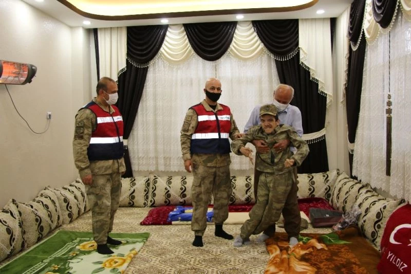 Şırnak’ın Uludere ilçesi Şenoba ve Hilal Jandarma Karakol Komutanlığı ekipleri, 21 yaşındaki bedensel engelli Mehmet Babat’ın askere gitme isteğini öğrendikten sonra harekete geçti. Askeri kamuflajla Mehmet’in evinin yolunu tutan ekipler, kıyafeti Babat’a giydirerek hayalini gerçeğe dönüştürdü.