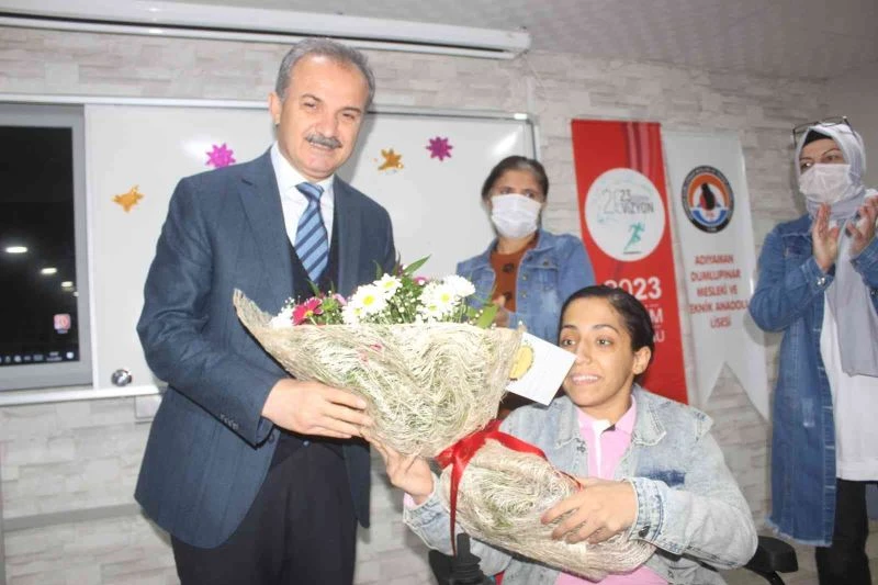 Adıyaman Belediye Başkanı Süleyman Kılınç, 3 Aralık Dünya Engelliler Günü dolayısıyla Adıyaman’da doğuştan bedensel engelli olan Adıyaman Dumlupınar Mesleki Ve Teknik Anadolu Lisesi 10.sınıf öğrencisi Kardelen Sinan’ı okulda ziyaret etti. Okulda Kardelen Sinan ile bir araya gelen Başkan Süleyman Kılınç, lise öğrencisiyle bir süre sohbet ederek onun sağlık durumu ve eğitim durumu hakkında bilgiler aldı. Başkan Süleyman Kılınç daha sonra okul idaresi tarafından 3 Aralık Dünya Engelliler Günü dolayısıyla okulun konferans salonunda düzenlenen etkinliğe katıldı. Burada öğrencilerin düzenlemiş olduğu etkinliği izleyen Başkan Süleyman Kılınç, daha sonra doğuştan bedensel engelli Kardelen Sinan’a akülü sandalye sürprizi yaptı. Akülü sandalyesine kavuşan Kardelen Sinan’ın mutluluğu yüzüne yansıdı.