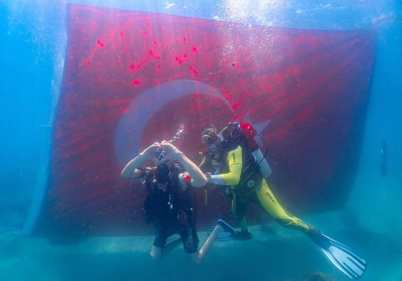Mersin’de 30 Ağustos Zafer Bayramı dolayısıyla düzenlenen etkinlikte Akdeniz’in mavi sularını keşfe çıkan engelli bireyler, deniz altında Türk bayrağı açarak zaferi kutladı.