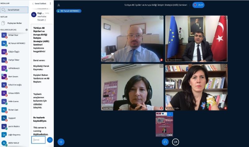 Yaşar Üniversitesi Halkla İlişkiler ve Reklamcılık Bölümü Öğretim Üyesi Doç. Dr. Huriye Toker’in koordinatörlüğünde yürütülen ve Jean Monnet modül projesi olarak 2017 yılında hibe almaya hak kazanan proje, 3 yıldır aralıksız devam ediyor. Canlı bağlantı ile seminer dersine katılarak AB-Türkiye ilişkileri ve AB İletişim Stratejisine ilişkin bilgiler aktaran Dışişleri Bakan Yardımcısı ve Avrupa Birliği Başkanı Faruk Kaymakçı, 2018 yılında gerileyen Türkiye-AB ilişkilerini tekrar canlandırmak için reformları hızlandırma gayreti içine girdiklerini söyledi. Kaymakçı, “Türkiye’nin adaylığının resmen onaylandığı 1999 yılından, AB’ye katılım müzakerelerin başladığı 2005 yılına kadar çok önemli reformlar yapıldı. Hatta Türkiye Cumhuriyeti’nin en reformcu dönemi oldu diyebilirim. 2018 yılında ise soğuyan ve gerileyen Türkiye-AB ilişkilerini yeniden yumuşatmak ve canlandırmak için reformları tekrar hızlandırdık. Vize serbestisi diyaloğunda da yerine getirmemiz gereken 6 kriter bulunuyor. Bunların büyük bir bölümü siyasi alanla ilgili. Umarım bu reform dalgasını hızlandıracağız” dedi.