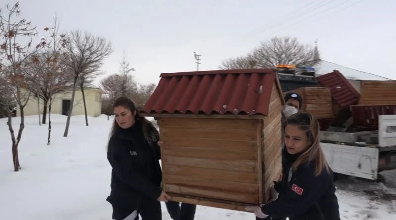 Van’ın Erciş Belediyesi, soğuk havalarda sokak hayvanlarının barınabilmesi ve yaşamlarını sürdürebilmesi için şehrin belli noktalarına kulübe bıraktı.