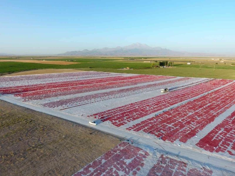 Kayseri’nin Yeşilhisar ilçesinde kurutulmak için serilen domatesler, tarlaları kırmızıya boyadı.