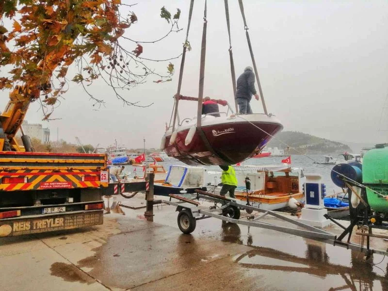 Balıkesir’in Erdek ilçesinde fırtına etkili oluyor. Denizde bağlı bulunan tekneler batmasını önlemek üzere vinç ile karaya alındı.