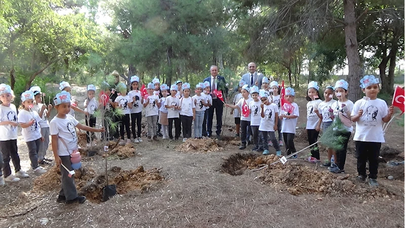 Kaymakam Aydın Tetikoğlu'nun da katıldığı etkinlikte, Erdemli Şehit Öğretmen Hacı Ömer Serin İlkokulu öğrencileri, Cumhuriyet'in 100. yılı kapsamında 100 fidanı toprakla buluşturdu.