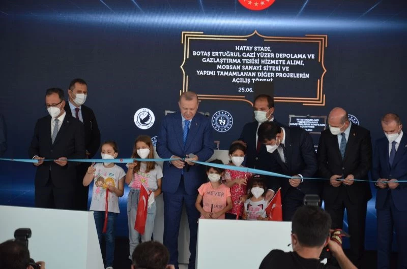 Cumhurbaşkanı Erdoğan, Hatay Stadı, BOTAŞ Ertuğrul Gazi Yüzer Depolama ve Gazlaştırma Tesisi Hizmete Alımı, MOBSAN Sanayi Sitesi ve yapımı tamamlanan diğer projelerin açılış törenine katıldı.