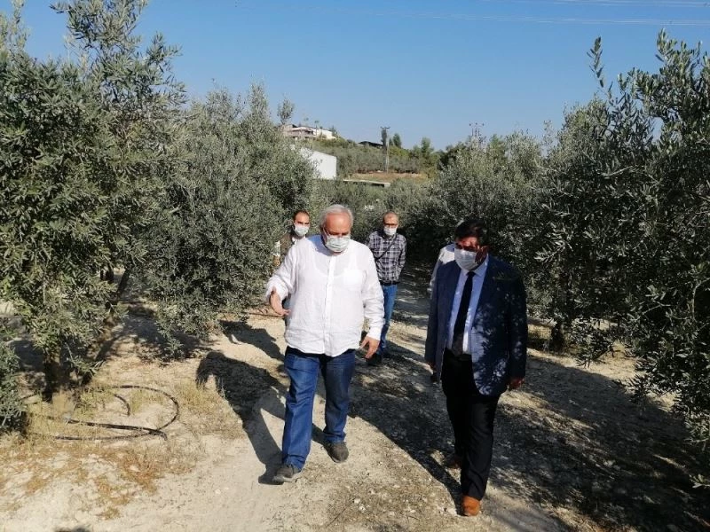 Heyet hasat yapılan zeytin bahçesini gezerek, üreticisinden, yaptığı bakım ve ilaçlama uygulamaları hakkında bilgi aldı.