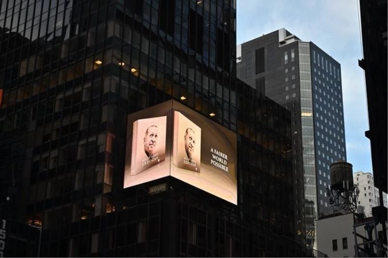 Cumhurbaşkanı Recep Tayyip Erdoğan’ın “Daha Adil Bir Dünya Mümkün” kitabı, kaleme aldığı Times Meydanı’ndaki ekranlara yansıtılarak tanıtıldı.