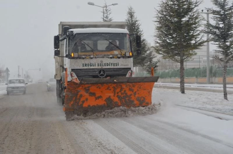 Konya’nın Ereğli İlçe Belediyesi kar yağışı sonrası araç ve yaya ulaşımında aksama yaşanmaması için yollarda kar temizleme çalışması yaptı.