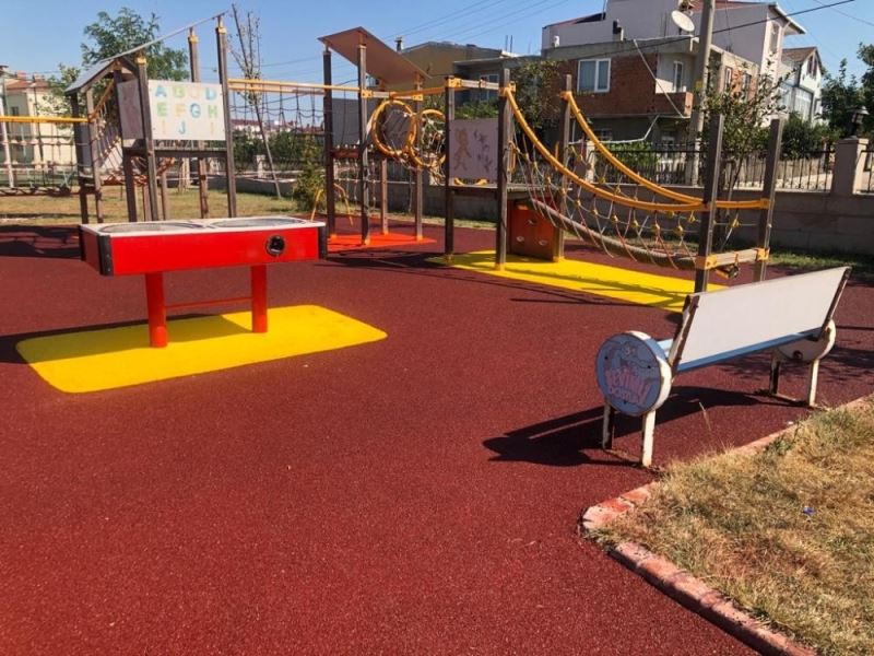 Yeşiltepe Mahallesi’nde yer alan Masal Park’ın bozulan kauçuk zeminini söken Ergene Belediyesi Fen İşleri Müdürlüğü ekipleri, kauçuk zemin kaplamaları ile beraber park alanında yer alan oyun gruplarının da bakımlarını yaparak yeniledi.