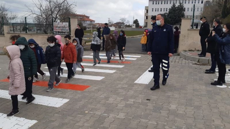 Ergene İlçe Jandarma Komutanlığı ve Ergene Belediyesi Zabıta Müdürlüğü ekipleri tarafından Ulaş Mahallesinde bulunan okulda küçük öğrencilere yaya geçidinden geçme kuralları hakkında bilgiler de verildi.