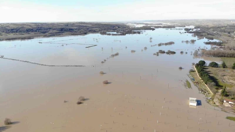Ergene Nehri’nin debisinin 20 kat artmasıyla Kırklareli’nin Pehlivanköy ilçesindeki panayır alanı ve tarım alanları sular altında kaldı.