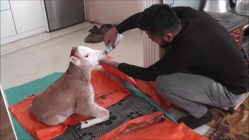 Buzağının yaklaşık bir hafta erken doğduğunu belirten Karakaş, “Buzağımız biraz erken doğduğu için rahatsızlığı var. Bir de hava şartları geceleri eksi 20 derecelerde olduğu için ahırda soğuk olduğundan üşüyordu. Bizde eve getirdik, bir haftadır evde kalıyor. Sobanın yanında biberonla besliyoruz. Evimize şenlik oldu. Gezdiriyoruz, oynatıyoruz, tarıyoruz yıkıyoruz” dedi.