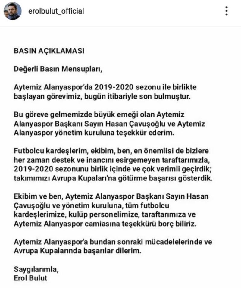 Erol Bulut yaptığı açıklamada şu ifadelere yer verdi: “Aytemiz Alanyaspor’da 2019-2020 sezonu ile birlikte başlayan görevimiz, bugün itibariyle son bulmuştur. Bu göreve gelmemizde büyük emeği olan Aytemiz Alanyaspor Başkanı Sayın Hasan Çavuşoğlu ve Aytemiz Alanyaspor yönetim kuruluna teşekkür ederim. Futbolcu kardeşlerim, ekibim, ben, en önemlisi de bizlere her zaman destek ve inancını esirgemeyen taraftarımızla, 2019-2020 sezonunu birlik içinde ve çok verimli geçirdik. Takımımızı Avrupa Kupaları’na götürme başarısı gösterdik. Ekibim ve ben, Aytemiz Alanyaspor Başkanı Sayın Hasan Çavuşoğlu ve yönetim kuruluna, tüm futbolcu kardeşlerimize, kulüp personelimize, taraftarımıza ve Aytemiz Alanyaspor camiasına teşekkürü borç biliriz. Aytemiz Alanyaspor’a bundan sonraki mücadelelerinde ve Avrupa Kupalarında başarılar dilerim.”