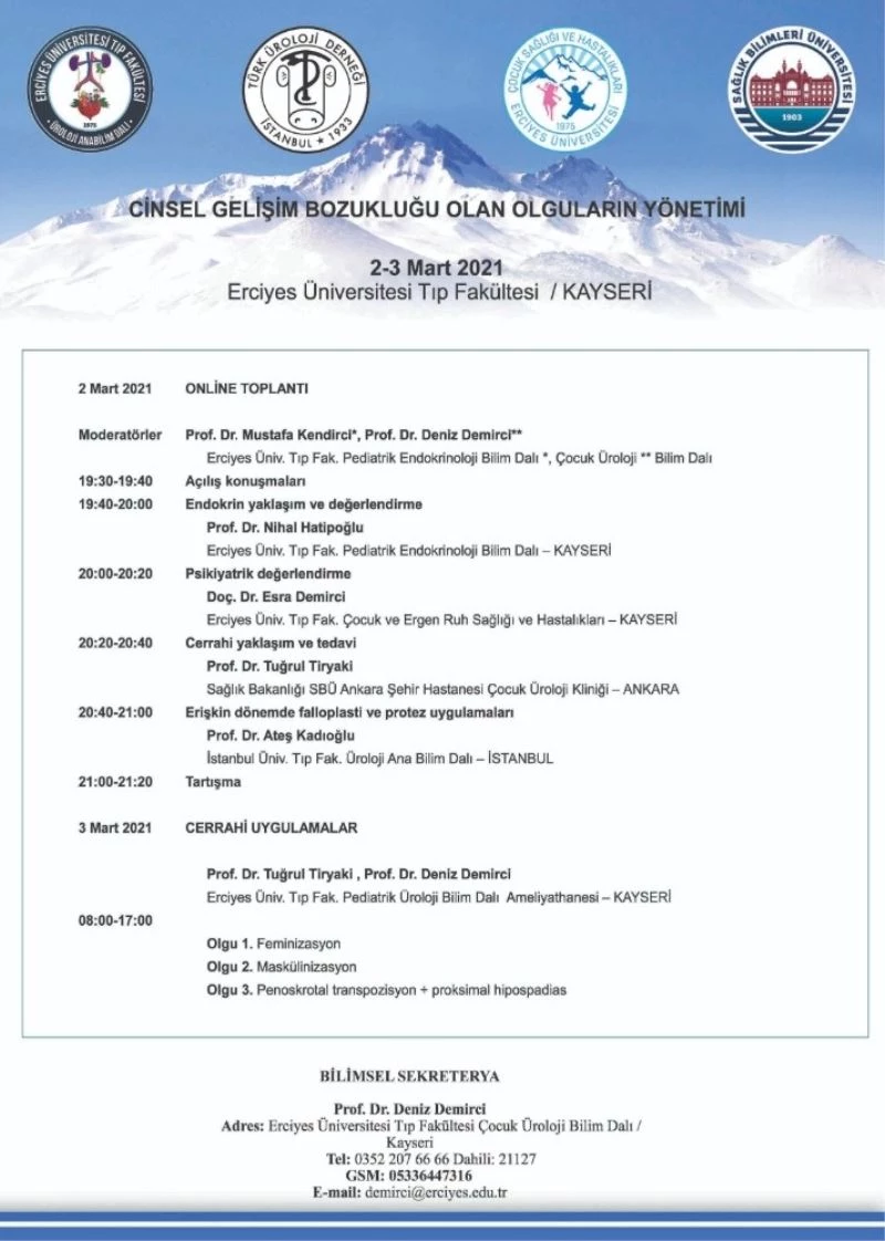Türk Üroloji Derneği’nin katkılarıyla Erciyes Üniversitesi Tıp Fakültesi’nin ev sahipliğinde düzenlenecek olan ’Cinsel Gelişim Bozukluğu Olan Olguların Yönetimi’ Toplantısı 2-3 Mart tarihlerinde online olarak yapılacak. 2 Mart’ta ’endokrin yaklaşım ve değerlendirme’, ’cerrahi uygulamalar’ olarak iki oturumda yapılacak olan toplantının moderatörlüğünü ise Prof. Dr. Mustafa Kendirci ve Prof. Dr. Deniz Demirci yapacak.