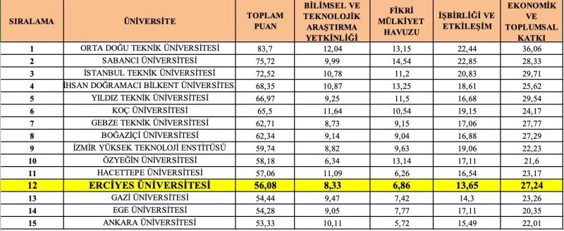 Türkiye’deki 36 devlet ve 14 vakıf üniversitesi olmak üzere sıralamadaki ilk 50 üniversitenin yer aldığı listede, Erciyes Üniversitesi (ERÜ) tüm üniversiteler arasında 12’nci, devlet üniversiteleri arasında ise 8’nci sırada yer alma başarısını gösterdi. ERÜ ayrıca “Ekonomik Katkı ve Ticarileşme” kategorisinde ise tüm üniversiteler arasında 8., devlet üniversiteleri arasında 6. sırada yer alarak önemli bir başarıya imza attı.