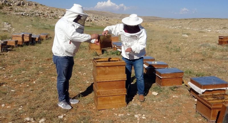 Erzincan’da Mayıs ayından bu yana geniş ve zengin bitki örtüsüne sahip yaylalarda arıcılık yapan arıcılar, bal hasadına başladı. Kavurucu sıcakta taktıkları maskelerle çalışan arıcılar, arıları kovanlardan uzaklaştırmak için duman çıkaran körük yardımıyla kovanlardaki petekleri çıkarıyor.