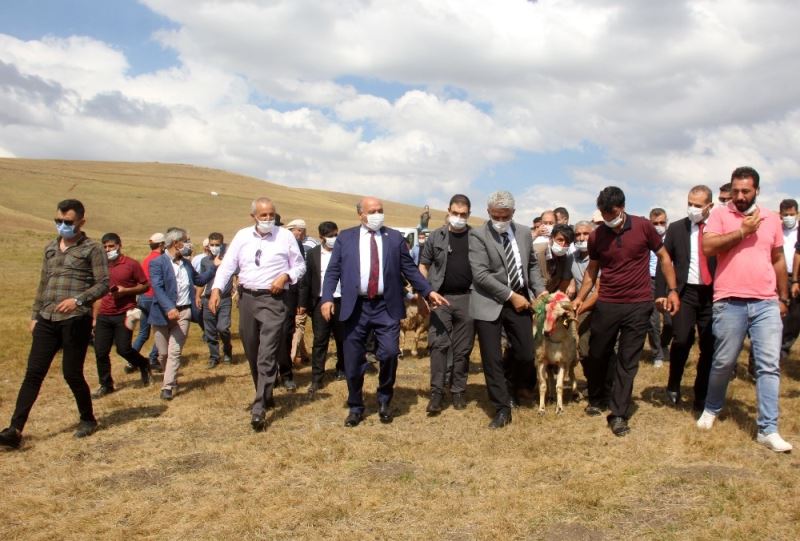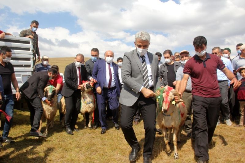 Karakaş cinsi koyun ırkının ıslahını sağlamak için düzenlenen şenlikte protokol mensupları çoban keçelerini giyerek kucaklarına aldıkları yavru kuzuyu sevmelerinin ardından üzerlerine Türk bayrağı çizili, süslenmiş damızlık koçları davul zurna eşliğinde sürülerin içine saldılar.