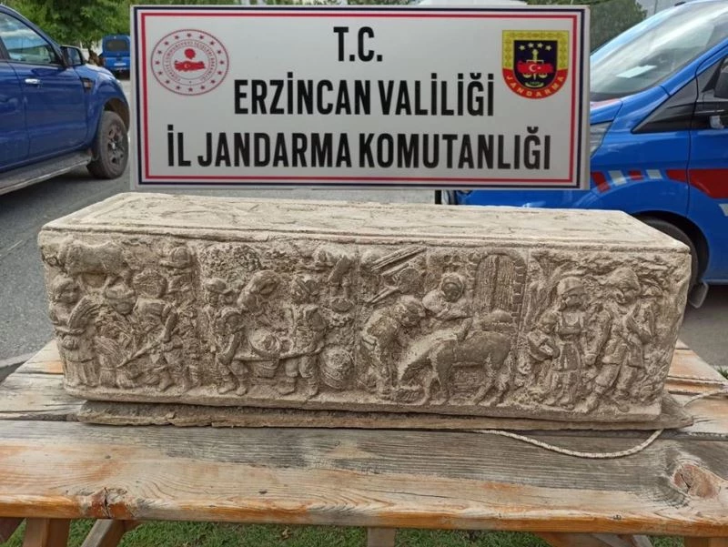 Erzincan İl Jandarma Komutanlığı ekiplerince, Erzincan’da ikamet eden 3 şahsın ellerinde bulundurmuş oldukları eski tarihi dönemlere ait olduğu değerlendirilen lahit mezarını para karşılığında satmak için alıcı arayışı içerisinde oldukları yönünde bilgi alındı. Kültür ve tabiat varlığı kaçakçılığı ile mücadele kapsamında, yapılan saha ve teknik çalışmalar sonucunda söz konusu lahit mezarını Erzincan ili merkez ilçesi sınırları içerisinde ikamet eden Ş.G. isimli şahsın gizlediği tespit edildi. Şüphelinin ikametinde yapılan aramada, evin arka bahçesine depo olarak kullanılan odada gizlenmiş vaziyette eski tarihi dönemlere ait olduğu değerlendirilen 1 metre uzunluğunda, 30 cm genişliğinde ve 30 cm yüksekliğinde, bütün yüzeylerinde eski tarihi dönemlere ait kabartma figür ve resimlerin bulunduğu lahit mezar ele geçirildi.