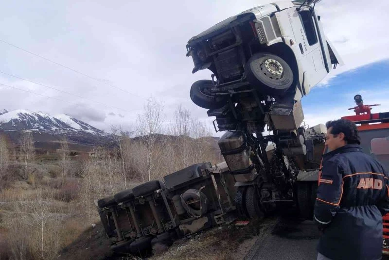 Erzincan’da zift yüklü tırın devrilmesi sonucu meydana gelen trafik kazasında sürücü yaralandı.