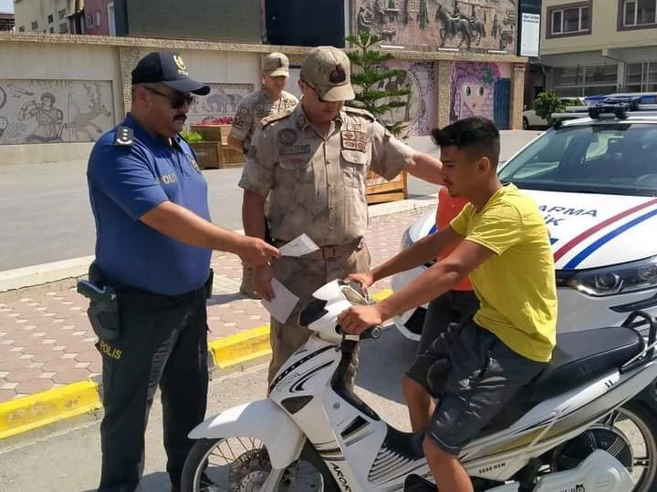 Erzin'de  trafik Polisleri ve Jandarma ekipleri ile oluşan trafik ekipleri motosiklet sürücülerini olası kazalara karşı kask takmaları konusunda uyardı.