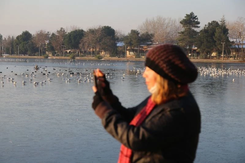 Gece saatlerinde termometrelerin sıfırın altında 10 dereceyi gösterdiği Kocaeli’nin İzmit ilçesinde bulunan gölet dondu.