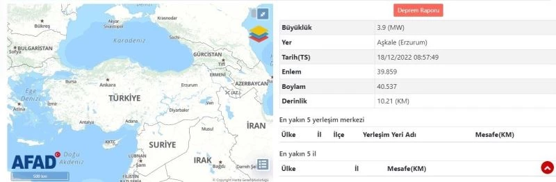 Afet ve Acil Durum Yönetimi Başkanlığı’ndan (AFAD) alınan bilgilere göre, 0Erzurum’da saat 11.57’de 3.9 büyüklüğünde bir deprem meydana geldi. Aşkale ilçesi merkezli deprem, yerin 10.21 kilometre derinliğinde gerçekleşti.
