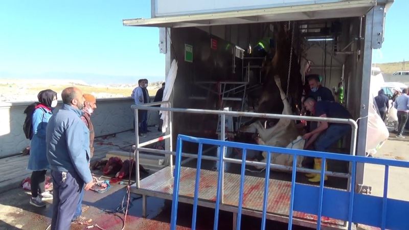 Erzurum’da Kurban Bayramı’nın ilk gününde alışılagelmiş görüntülerin dışında kurulan mobil mezbahalarda vatandaşlar kurbanlarını pandemi sürecine uygun şartlarda kestirdiler.