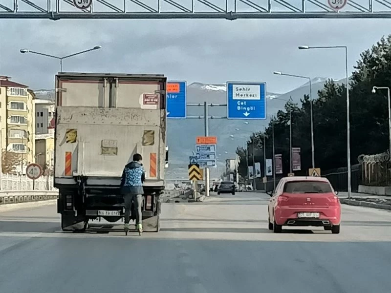 E-80 karayolu üzerinde seyir halindeki kapalı kasa bir kamyonun arkasına tutunan patenli genç, görenlerin yüreklerini ağza getirdi. Yaklaşık 2 kilometre kamyonla birlikte ilerleyen genç, sürücülerin uyarı kornolarına kulak asmadı.