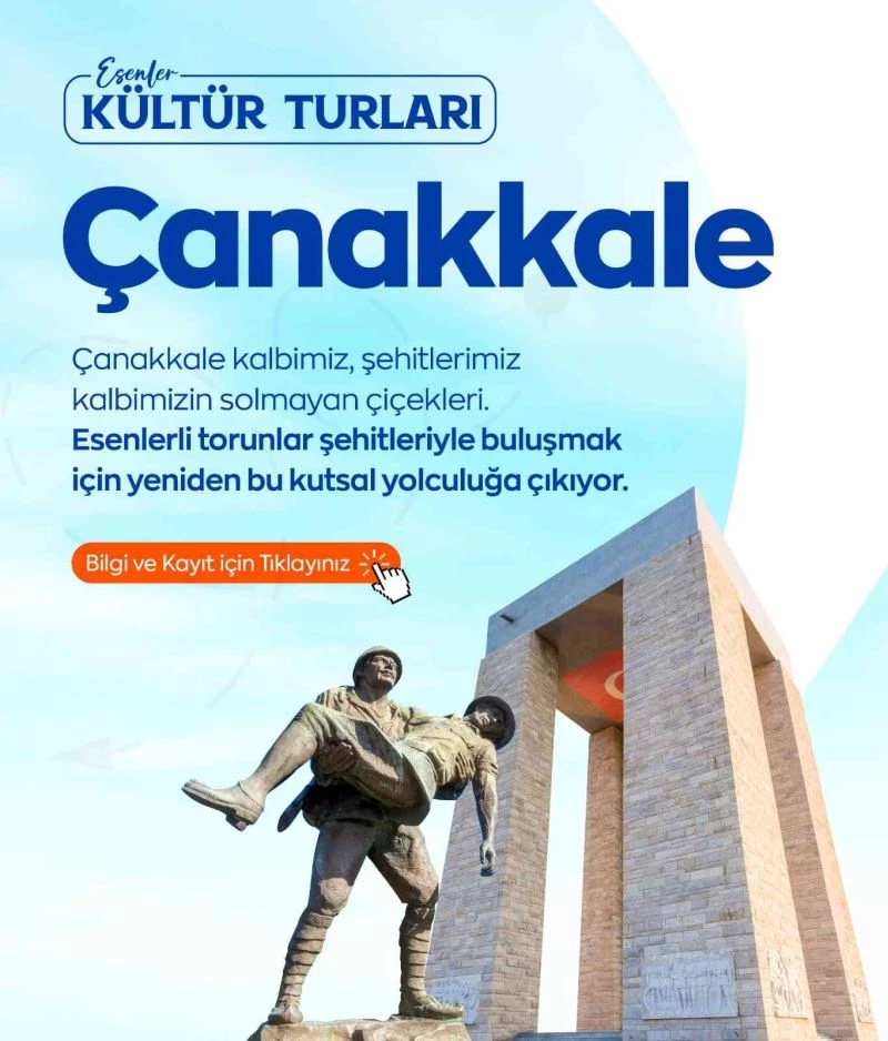 Esenler Belediyesi, tarihi yakından tanımak, şehitleri anmak ve manevi değerlere sahip çıkmak amacıyla pek çok kültür turu düzenleyecek. Kültür turlarının ilk durağı ise şehitler yurdu Çanakkale olacak. Esenlerliler burada tarihin en çetin ve en büyük savaşlarından birinin kazanıldığı toprakları ziyaret ederek yurdu canı pahasına savunanların izini sürecek. Şehitlikleri ziyaret etme imkanı yakalayacak olan Esenlerliler, program boyunca uzman rehberler eşliğinde bölgeyi tanıyacak.
