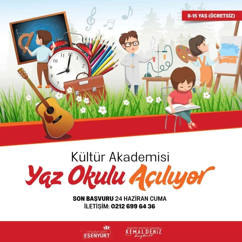 Esenyurt Belediyesi, çocukların tatil yaparken de kendilerini geliştirmeleri için yaz okullarını açıyor. Yaz okulları çerçevesinde 8-15 yaş aralığındaki çocuklar; matematik atölyesi, akıl ve zekâ oyunları, çocuk korosu, halk oyunları, bilgi ve kültür yarışmaları gibi birçok farklı branşla buluşturulacak. Çocuklar yaz boyu hem öğrenecek hem de keyifli vakit geçirecek. Kayıt yaptırmak isteyenler 24 Haziran Cuma gününe kadar Esenyurt Kültür Merkezi, Sürekli Eğitim Merkezi, Esenkent Kültür Merkezi, Siteler Kültür Merkezi, Nene Hatun Kültür Merkezi, Sarıkamış Şehitleri Kültür Merkezi, Mustafa Akboğa Kültür Merkezi, Mehterçeşme Bilgi ve Etüt Evi, Papatya Bilgi ve Etüt Evi, Roman Kültür Evi, Saadetdere Bilgi ve Etüt Evi, Saadetdere Gençlik Merkezi, Şahin Aslan Bilgi ve Etüt Evi, Yunus Emre Kültür Merkezi, Yunus Balta Kültür Merkezi, Çınar Gençlik ve Kültür Merkezi ile iletişime geçip kayıt yaptırabilecek.