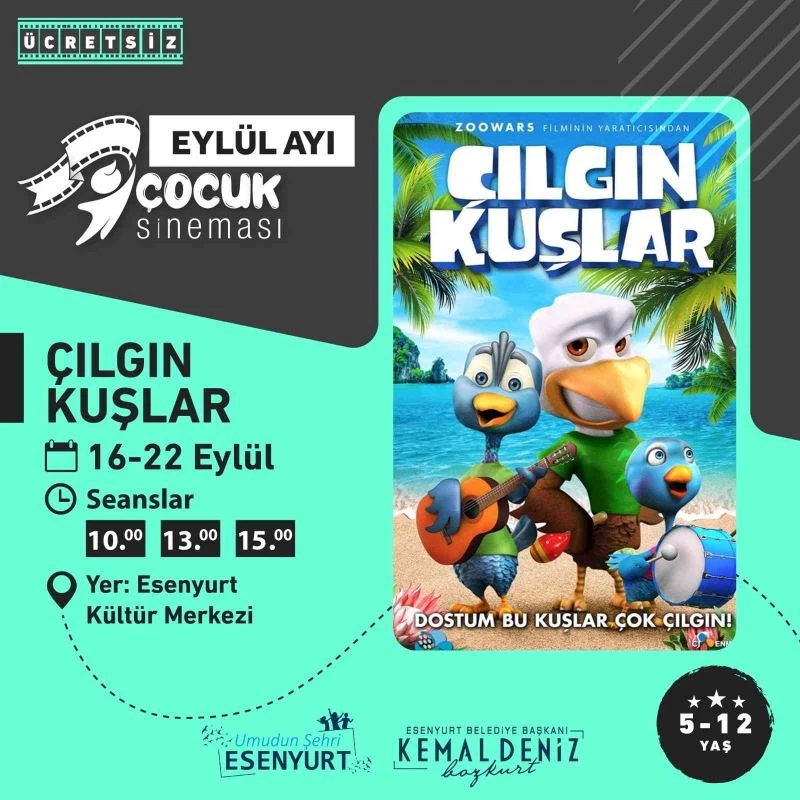 Esenyurtlu çocukların keyifli vakit geçirebilmeleri için gerçekleştirdiği etkinlikleri her geçen gün artıran Esenyurt Belediyesi, “Eylül Ayı Çocuk Sineması” programı düzenliyor. Esenyurt Kültür Merkezi’nde gerçekleşecek olan program, 9-15 Eylül tarihleri arasında üç seans şeklinde devam edecek. Çocuklar, etkinliğin ilk haftasında “Tüylü Arkadaşlar” isimli animasyon filmi ile iki yavru kuşun heyecan dolu hikâyesine ortak olacak. Etkinliğin ikinci haftasında gösterime girecek olan “Çılgın Kuşlar” isimli filmde ise şarkı yarışmasına katılan orman hayvanlarının yaşadığı eğlenceli anlar, Esenyurtlu minikleri keyifli bir yolculuğa çıkaracak.