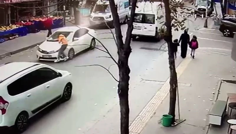 Kaza, dün öğlen saatlerinde Esenyurt İncirtepe Mahallesi’nde bulunan bir caddede yaşandı. Edinilen bilgiye göre, 12 yaşındaki Mustafa İzbero bakkala gitmek için işyerinden çıktı. Koşarak yolun karşısına geçmek isteyen İzbero’ya, seyir halinde olan bir otomobil çarptı. Kafasını arabanın camına vuran küçük çocuk, çarpmanın etkisiyle yola savruldu. Çevredeki vatandaşların ihbarı üzerine olay yerine polis ve sağlık ekipleri geldi. Kazada hafif şekilde yaralanan küçük çocuk, sağlık ekiplerinin müdahalesinin ardından hastaneye kaldırıldı. Yaşanan kaza anları ise çevredeki bir işyerinin güvenlik kamerasına yansıdı. Kaza sonrasında hastaneye kaldırılan İzbero’nun durumunun ise iyi olduğu öğrenildi.