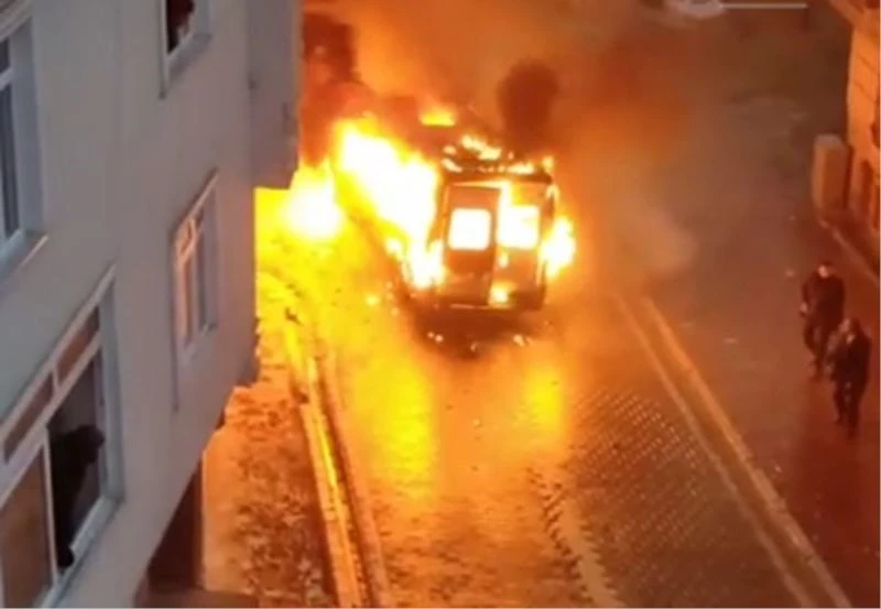 Esenyurt’ta işçi servisi minibüsü sokak arasında adeta alev topuna döndü. Yanan araç binalara da zarar verirken, olayda ölen ya da yaralanan olmadı.