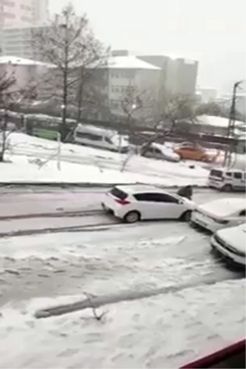 Esenyurt’ta bir kişi yoğun kar yağışında kayan aracını durdurmak için direksiyondan inip aracın önüne atladı. Buz pistine dönen aynı yolda başka bir minibüs ise dönerek yokuş aşağıya indi.