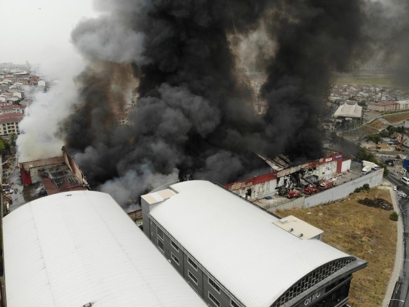 Esenyurt’ta lojistik deposunda çıkan yangın havadan drone ile görüntülendi