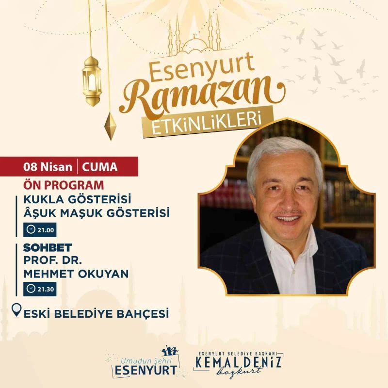 On bir ayın sultanı Ramazan’ın gelmesiyle birlikte Esenyurt Belediyesi Ramazan coşkusunu yansıtan etkinlikler gerçekleştiriyor. Etkinlikler çerçevesinde iftar ve teravih sonrasında Esenyurtlu vatandaşlar eski Ramazan günlerini yeniden yaşayacak. 6-30 Nisan tarihleri arasında Ramazan ayının maneviyat yüklü atmosferinin doyasıya yaşanacağı etkinliklerde; dini sohbetler, Türk Sanat Müziği dinletileri, Türk Tasavvuf Müziği dinletileri, Semazen gösterileri, Meddah gösterileri, canlı Hacivat-Karagöz gösterileri, kukla ve gölge oyunları, orta oyunu gösterileri, tiyatro oyunları ve yarışmalar yer alacak. Eski Belediye Bahçesi’nin şenlik alanına dönüşeceği etkinliklerde vatandaşlara, Ramazan’a özel ikramlarda bulunulacak.