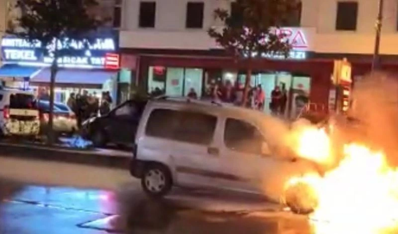 Esenyurt’ta seyir halindeki bir araç alev alarak kullanılamaz hale geldi, o anlar cep telefonu kamerasına yansıdı.