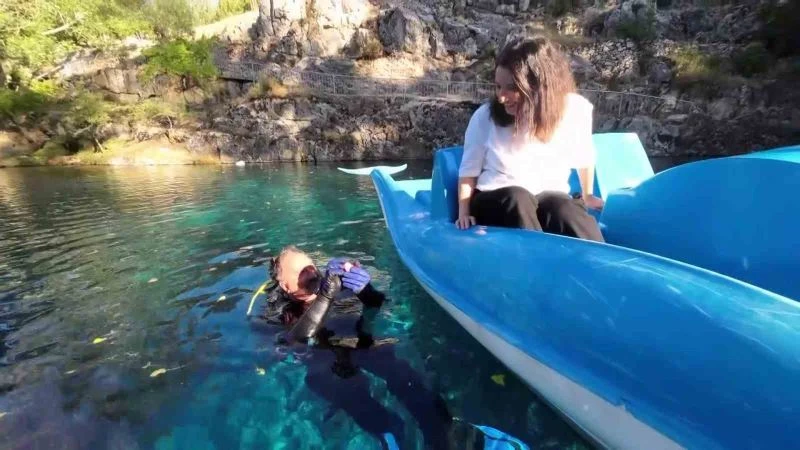Sivaslı iş adamı Erol Bozkuş, evlilik yıl dönümlerinde eşi Gül Bozkuş’a öyle bir sürpriz yaptı ki hem centilmenlik sınırlarını zorladı hem de çıtayı yükselttiği için diğer erkekleri zora soktu. Bozkuş, 27. evlilik yıl dönümünde eşi Gül Bozkuş’u ismini renginden alan Gökbınar Gölü’ne götürdü. Eşi deniz bisikletiyle göl yüzeyinde turlarken Bozkuş da 17 metre derinlikteki göle dalarak, daha önce göl zeminindeki bir küp içerisinde gizlediği yüzüğü çıkartıp eşine hediye etti. Sınırları zorlayan sürprizini ölümsüzleştirmek isteyen Bozkuş, tüm olup bitenleri aşama aşama kaydettirdi.
