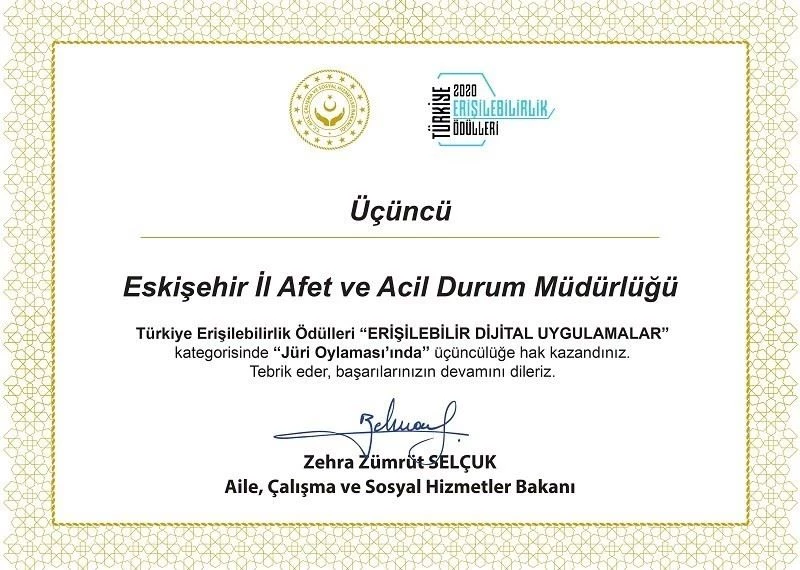 Aile, Çalışma ve Sosyal Hizmetler Bakanlığı tarafından bu yıl ikincisi düzenlenen Türkiye Erişilebilirlik Ödülleri "Erişilebilir Dijital Uygulamalar" kategorisinde, Eskişehir Afet ve Acil Durum Yönetimi İl Müdürlüğü (AFAD)’ın "Afetlere Karşı Engelleri Birlikte Aşalım" projesi dereceye girerek üçüncü oldu.