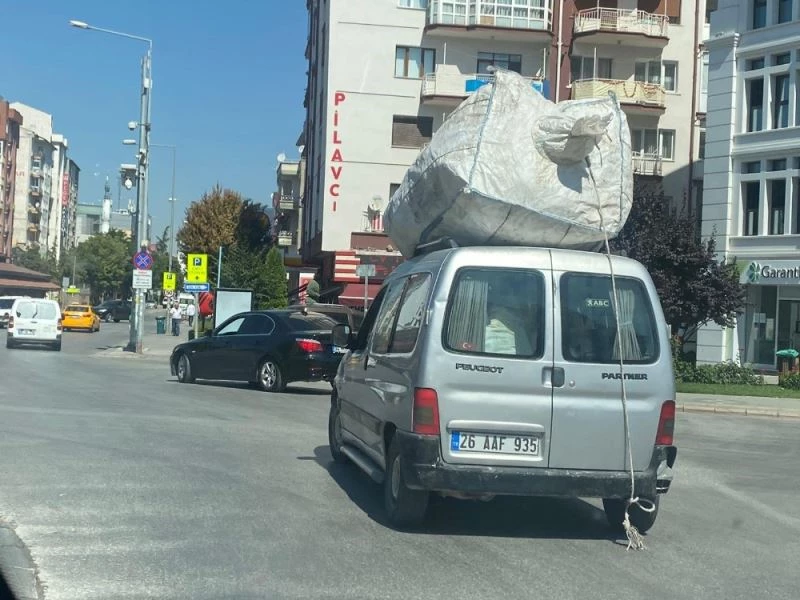 Eskişehir’de, bir sürücünün aracının üstünde bağladığı kocaman büyük bir çuvalla şehir merkezindeki yolculuğu görenleri hayrete düşürürken sürücüleri endişelendirdi