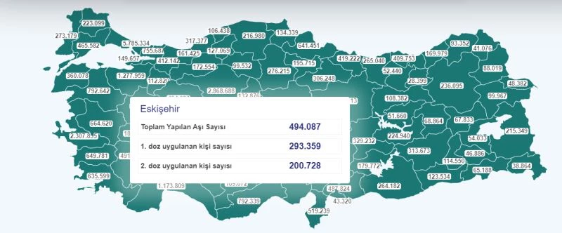 Sağlık Bakanlığı tarafından açıklanan rakamlara göre; Eskişehir genelinde bugüne kadar toplam yapılan aşı sayısı 500 bine yaklaşırken, 2. doz aşı olanların sayısı 200 binin çizgisini geçti. Pazartesi sabaha kadar kentte toplamda yapılan aşı sayısı 494 bini geçerken, 1. doz aşı uygulanan kişi sayısı 293 bin 32 olarak gerçekleşti. 200 bin 718 kişi ise 2. doz aşılarını tamamlayıp Korona virüse karşı korunaklı oldu.