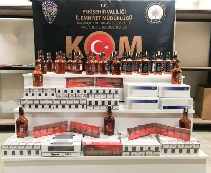 Eskişehir’de emniyet ekiplerinin bir kişinin evinde ve garajında yaptığı arama çalışmasında 42 şişe kaçak ve sahte bandrollü viski ve 870 paket bandrolsüz kaçak sigara ele geçirildi.