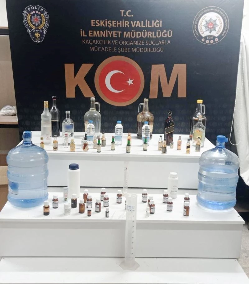Eskişehir’de bir işyerinde yapılan aramada 40,5 litre sahte alkollü içki, 24 şişe anason yağı ve 6 adet endüstriyel malzeme ele geçirildi.
