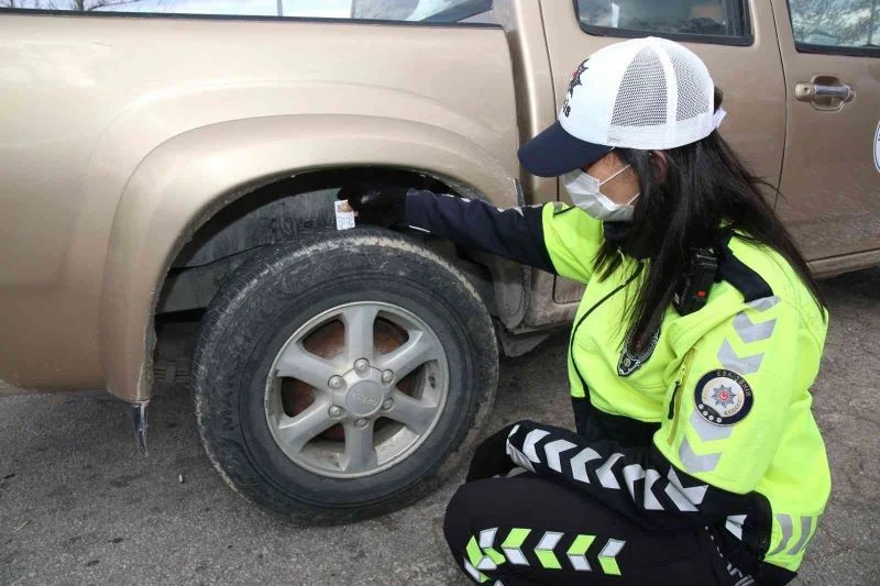 Uygulama noktasında yapılan denetimde durdurulan araçların lastikleri kontrol edildi. Kış lastiği olmayan araçlara cezai işlem uygulanırken, takılı kış lastiklerinde diş derinliği kontrol edildi.
